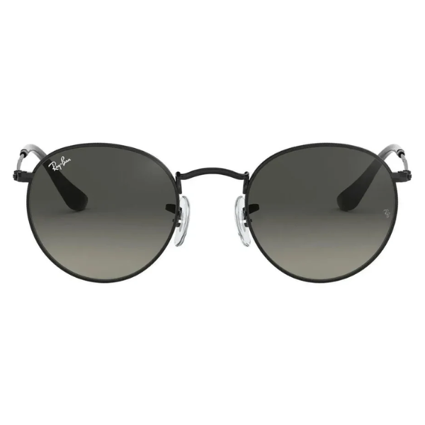 Montura metálica negra ultraliviana con puente curvo y patillas finas. Lentes redondos gris degradado que aportan un estilo retro, elegante y atemporal. Ideal para quienes buscan un look sofisticado con personalidad.